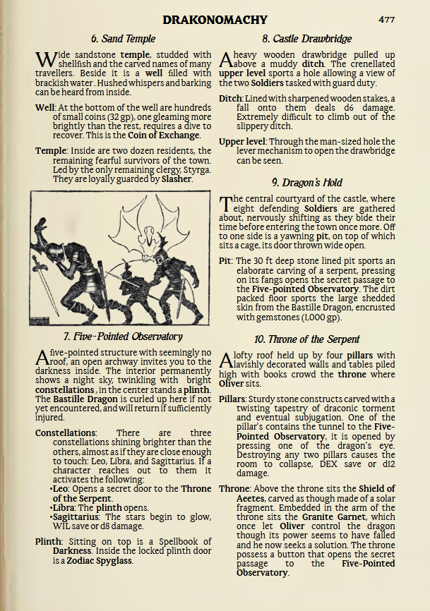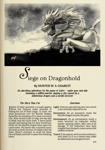 Pulled from an old Drakonomachy magazine published nearly 100 years ago comes a 4 page adventure for Cairn 2e inspired by Conan and Jirel of Joiry. Vastly under appreciated at the time as the game system did not yet exist, this entry was panned for being "too experimental" and "not containing a complete story". Now modern day readers are afforded the opportunity to explore the castle town of the famed Dragonhold, though they may find it infested with its very namesake. Will they seek to slay it for glory, or scamper off with whatever they can loot? Hopefully a mix of both, but as long as they survive it can surely be considered a victory.